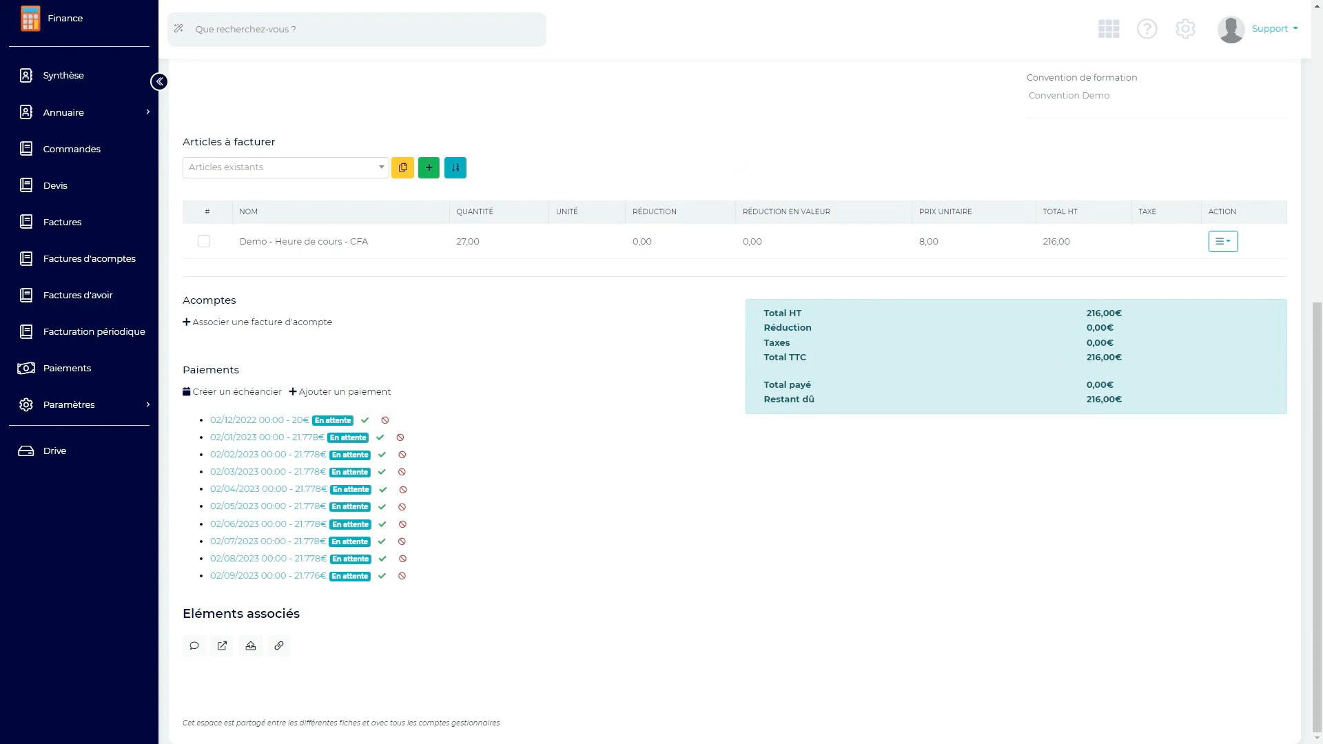 Afin de visualiser le solde à régler de chaque facture émise, peuvent être associés des acomptes versés, avoirs éventuels, ainsi que des paiements ponctuels et/ou issus d’un échéancier associé. Cet échéancier peut être recalculé en cas d’incident sur l’une ou l’autre des échéances prévues.