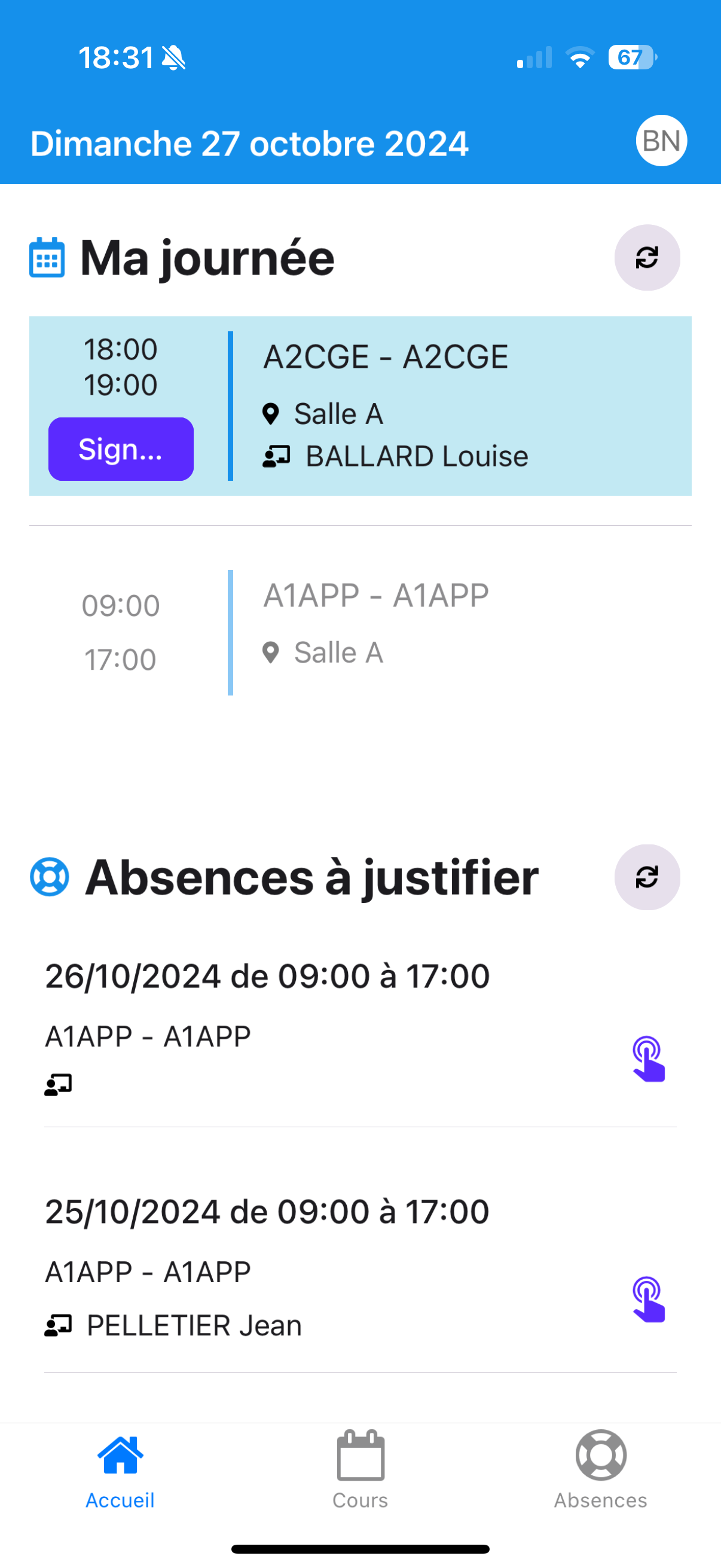 Sur l’écran d’accueil de son application mobile, l’apprenant visualise en temps réel son planning de cours (dont sessions d’émargement en cours), ainsi que les absences à justifier. Des notifications peuvent compléter ce dispositif.