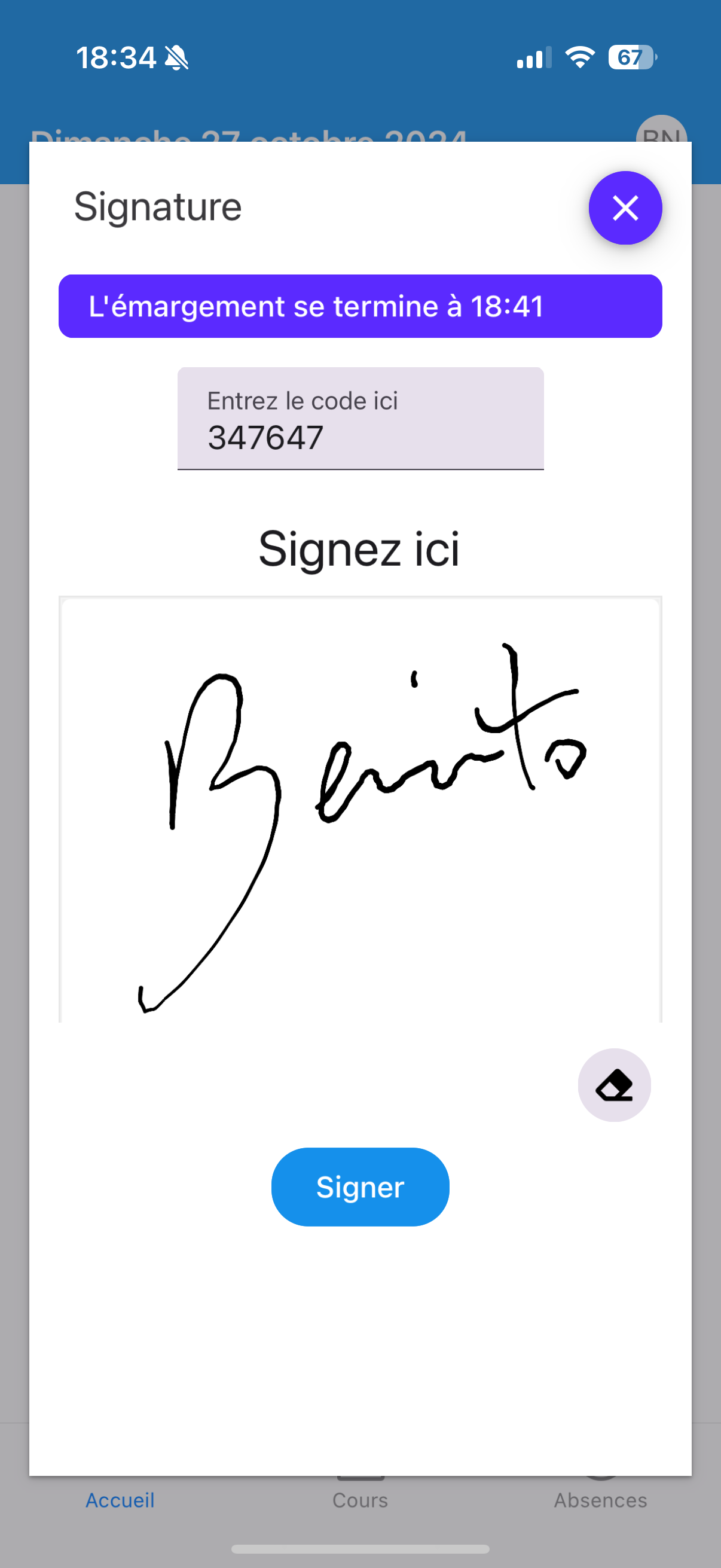 Lors de son cours, le formateur génère un code unique associé à la session d’émargement, qu’il communique aux apprenants pour saisie sur leur application… et signature à l’écran, si requis.